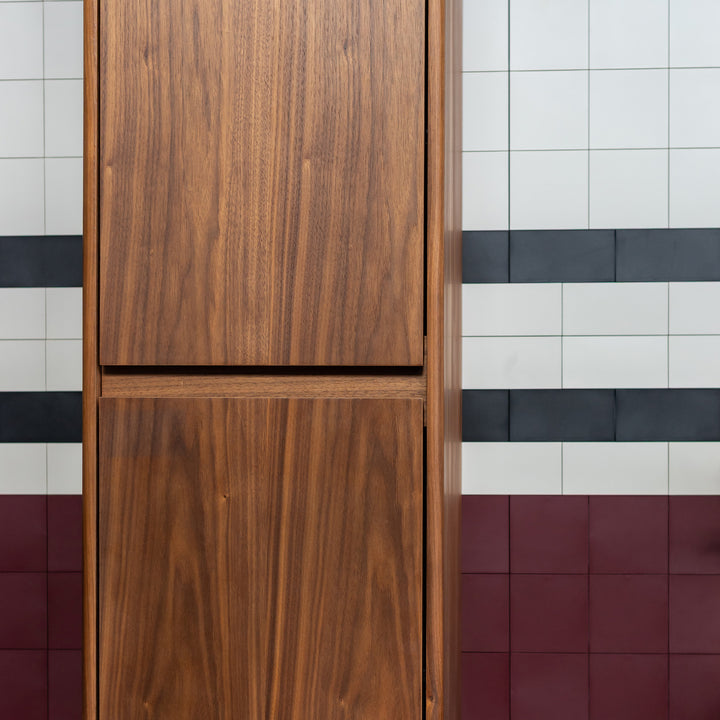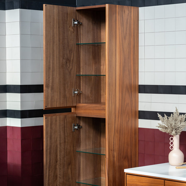 La lingerie suspendue IRWIN présente un design rectangulaire élégant avec des tablettes amovibles en verre et deux portes, ce qui en fait un meuble de rangement esthétique pour tout décor d'intérieur au goût du jour moderne et classique.
