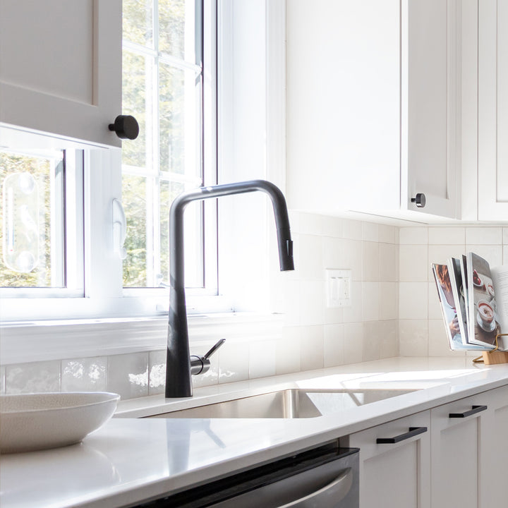 Optez pour un look luxueux dans la cuisine avec le robinet noir mat MASTER-BK. Son design carré simple en fait un élément intemporel qui s'adapte aussi bien aux cuisines traditionnelles que contemporaines, tandis que la finition noire mate lui confère un style inégalé. Le pulvérisateur extractible offre 2 options de jet pour plus de polyvalence dans la cuisine. La construction en laiton massif ainsi que la cartouche en céramique assurent sa qualité et sa durabilité. Un choix tendance pour votre cuisine !