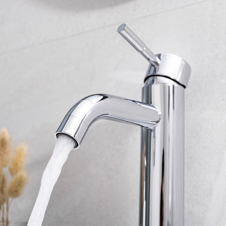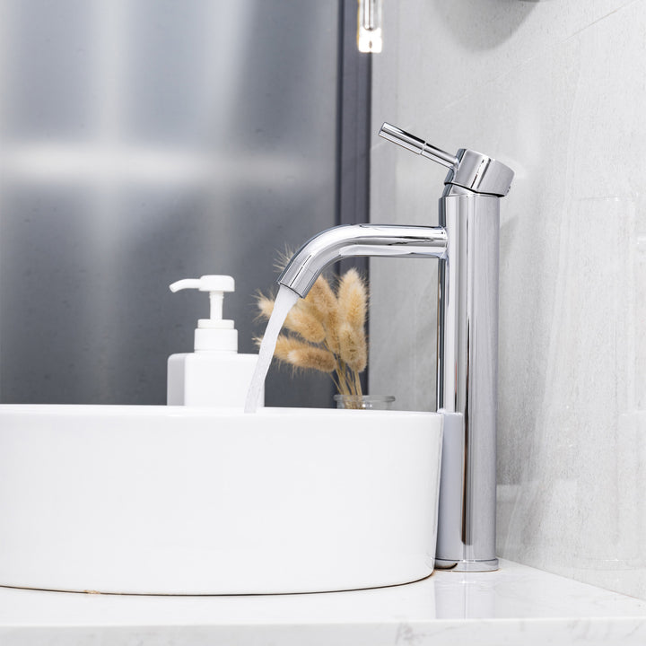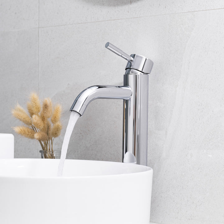 Simple et tendance, ce grand robinet de salle de bain dispose d’un bec haut, idéal pour les lavabo vasque ou les lavabos sans trous de robinet. La poignée unique facilite le contrôle de la température et du débit ainsi que la création d’un look unique et plus propre. Grâce au corps en laiton et à la cartouche en céramique, la durabilité du produit est assurée.