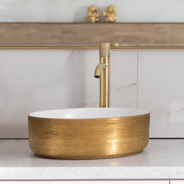 Soyez tendance avec le robinet ROSABELLA-GD. Son bec allongé et haut permet plus d'espace entre l'évier et le robinet, faisant du lavage des mains une expérience plus confortable. Sa cartouche en céramique et sa construction en laiton massif rendent le robinet très durable. Complétez votre lavabo avec ce robinet élégant et minimaliste !