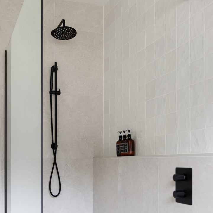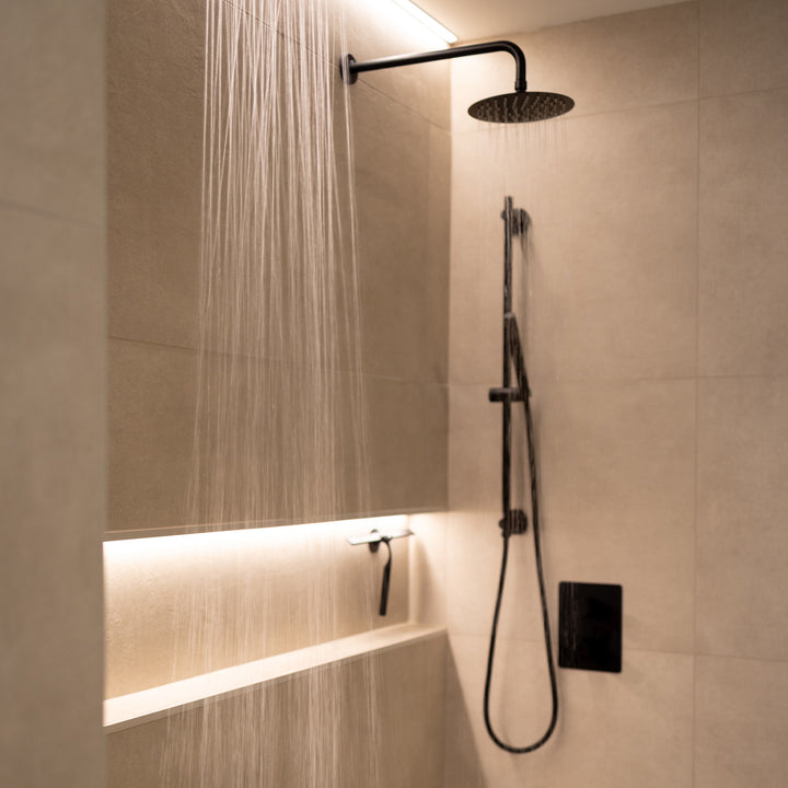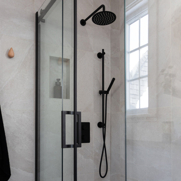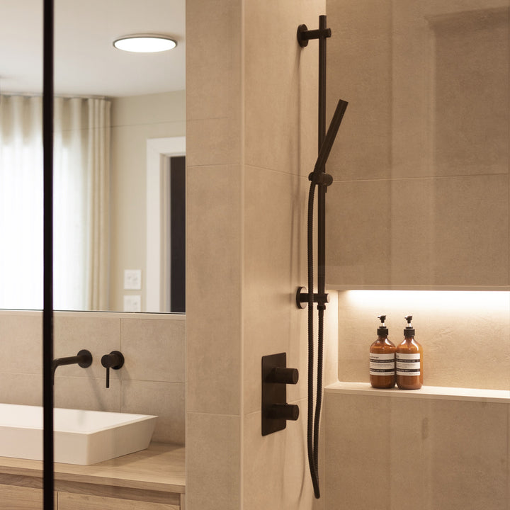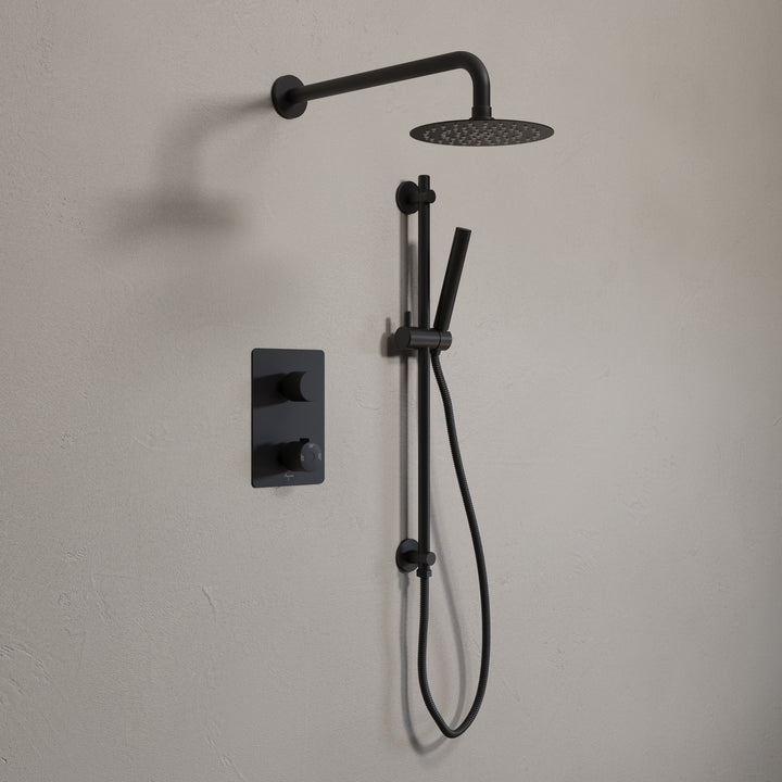 Ensemble de douche thermostatique: pomme de douche, douchette sur rail et valve avec fini noir mat
