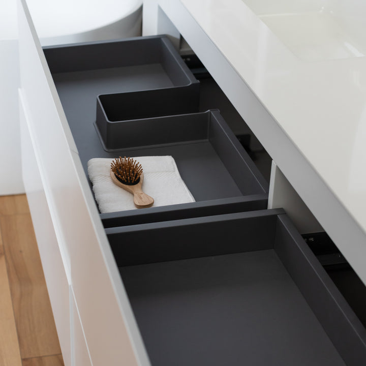 Laissez-vous séduire par la vanité suspendu ILANKA, caractérisée par ses lignes épurées et contemporaines avec sa façade de bois laqué blanc mat et son comptoir en quartz blanc. Conçue avec quatre tiroirs de bonne dimension, elle vous permettra aisément de disposer tout votre nécessaire ou accessoires.