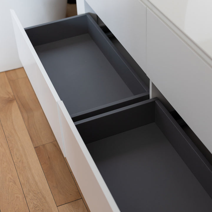 Façade de tiroir en placage de bois laqué couleur blanc mat.