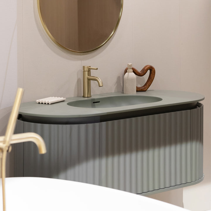 An original and stunning vanity unit, featuring a single drawer and storage on each side, all adorned with a kahki wood veneer front. Enhanced with soft-close drawer slides, it blends functionality with exquisite design seamlessly.