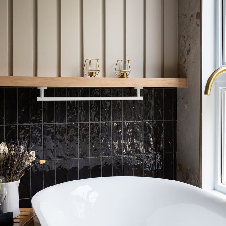 This matte white towel holder brings a minimalist and elegant style to your bathroom. This model is easy to install and has 24'' length.