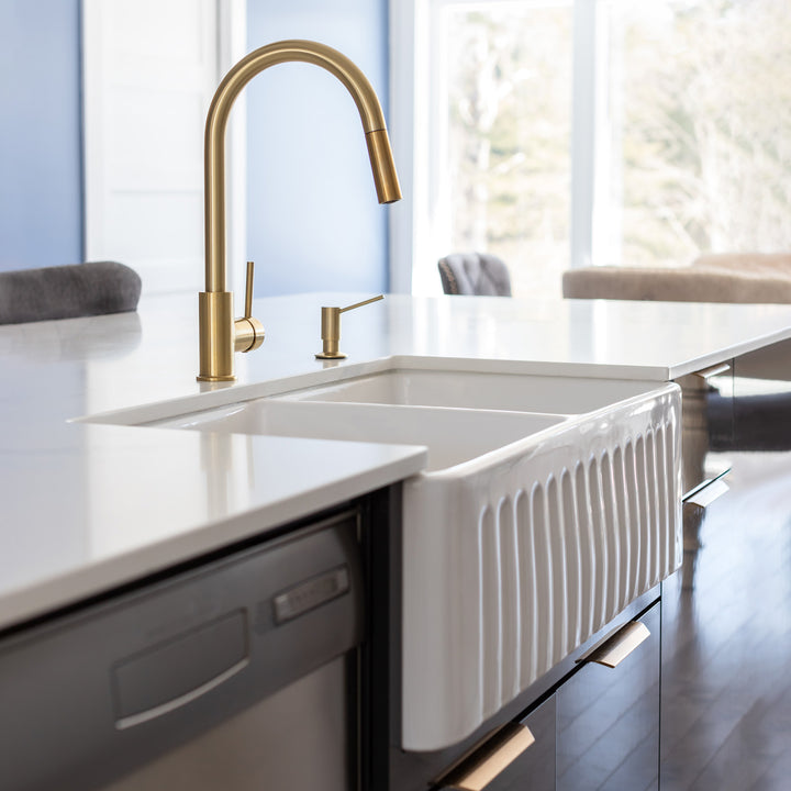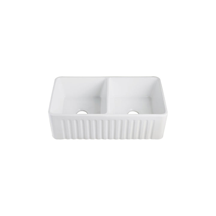 This high quality white gloss double bowl farmhouse kitchen sink combines the popular apron front style with the beauty, strength and durability of fireclay. The EMIRALD sink adds a bold, architectural element to your kitchen. Pair it with the countertop faucet of your choice to enhance the look of your kitchen, giving it a contemporary or industrial touch.
