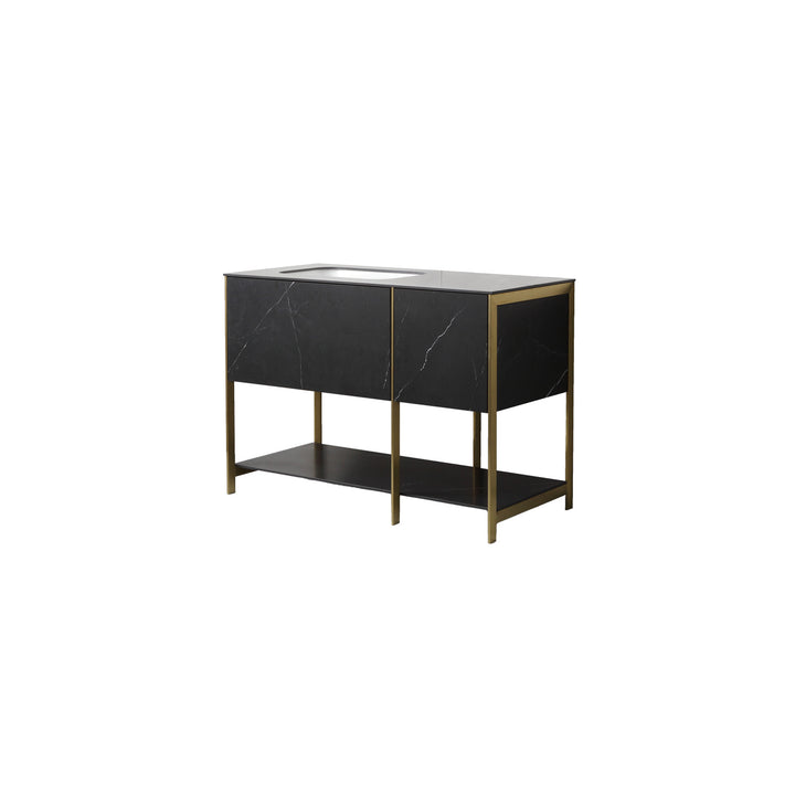 Size: 46 7/8'' x 22 5/8'' x 33 1/2'' Vanity unit with 2 drawers. Drawer and counter front in porcelain tile # Liem Black. U-shaped opening for piping. No drilled holes on the counter. Choice of wall-mounted or single-hole faucet. Faucet and drain sold separately. Countertop with built-in washbasin in glossy white ceramic. Soft-close drawer slides. Adjustable legs. Gold finished metal structure. DTC push-to-open drawer slides with synchronizer.