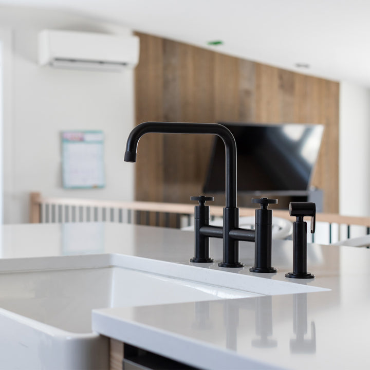 Our MONTI-BK kitchen faucet reinvents the classic bridge faucet configuration with industrial design elements for a glamour modern look. Because of its added architectural elements and detailing, the premium matte black finish will pop against your surrounding kitchen decor. Allow the brass construction, side sprayer, and swivel abilities to provide a sturdy and reliant fixture, great for use with any sink.