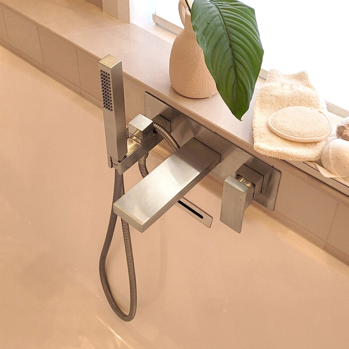 Square shape and elegant, this wall mounted bathub faucet is ideal for modern or classic style bahtrooms. Its unique handle facilitates temperature control and its hand shower will be a real ally for rinsing. This faucet will certainly be an excellent addition to your bathroom!