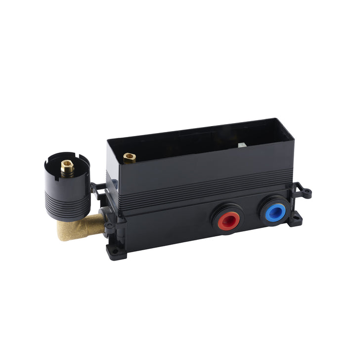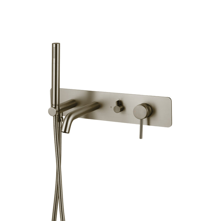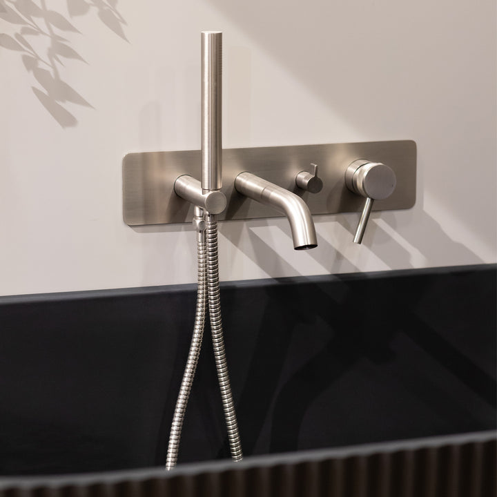 Solid brass construction Wall mounted installation Metal hand shower Corrosion resistant Ceramic cartridge Pressure regulating system Connects with 1/2” hoses Tub filler : 6.44 gpm max, 72.52 psi Hand shower : 4.36 gpm max, 72.52 psi