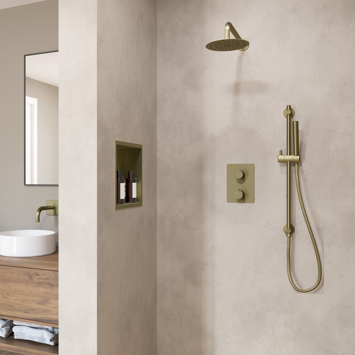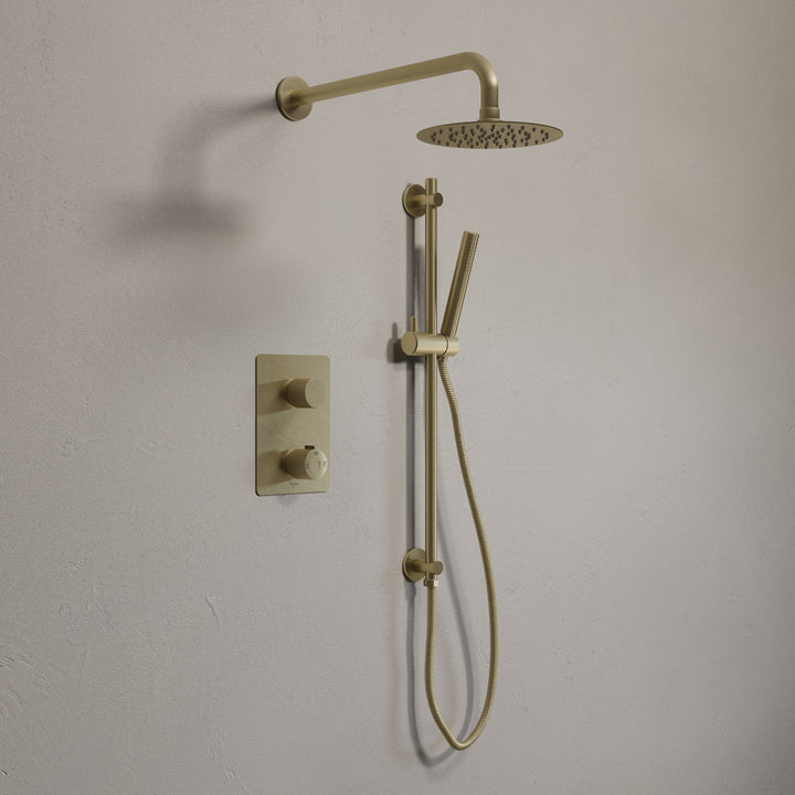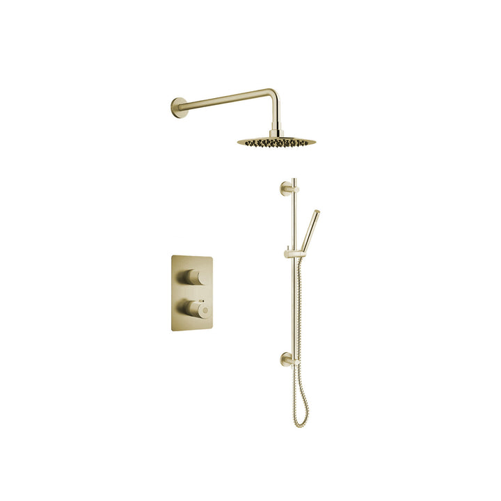Thermostatic Shower Set Including Shower Head, Handshower On Rail And Valve In Brushed brass (gold)