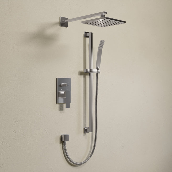 Complete your bathroom by adding this 2-function bath shower faucet. This set includes the rain head shower, the hand shower and rail, the valve and the diverter. The ceramic cartridge and the solid brass body ensure the longevity. VITO is the perfect design for a modern-style bathroom.